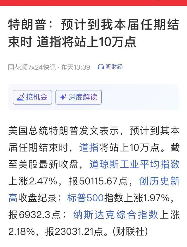 而在美股突破5万点大关后,特朗普的一条推文更是引发市场热议,他自信预测道指将在其任期结束前触及10万点,并强调“特朗普在所有事情上都是对的”,这份乐观情绪也在一定程度上感染了市场。