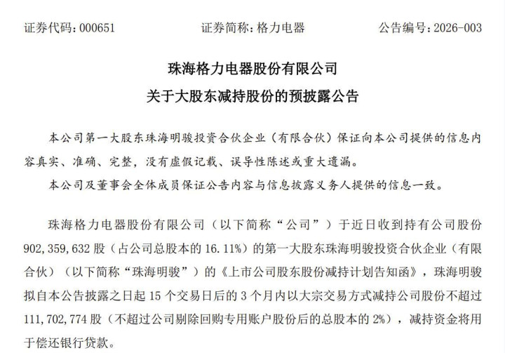 近日,珠海格力电器股份有限公司(下称“格力电器”)发布公告称,其第一大股东珠海明骏投资合伙企业(有限合伙)(下称“珠海明骏”)拟自公告披露之日起15个交易日后的3个月内,以大宗交易方式减持公司股份不超过约1.11亿股,且明确减持资金将用于偿还银行贷款。