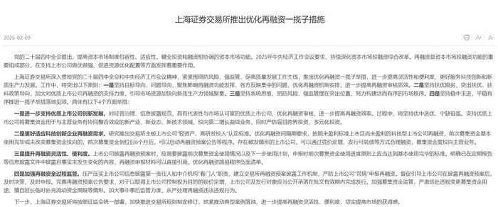 2月9日,沪深京交易所分别在官网推出优化再融资一揽子措施。沪深京交易所明确,对经营治理与信息披露规范,具有代表性与市场认可度的优质上市公司,优化再融资审核,进一步提高再融资效率。