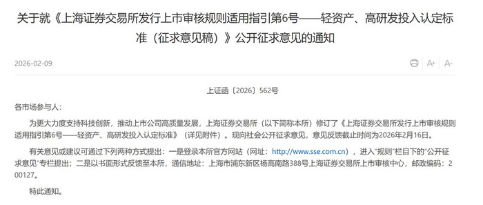 2月9日,上交所在官网推出优化再融资一揽子措施。值得关注的是,此次上交所同步发布了修订《上海证券交易所发行上市审核规则适用指引第6号--轻资产、高研发投入认定标准》(以下简称《6号指引》)的征求意见稿。